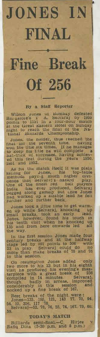 Billiards – T.A. Selvaraj (Mysore) v S .N. Sinha (Bihar) 1 p. m. and 3.30 p.m. Wilson Jones v M. H. M. Mujahid (Ceylon) 5-30 p.m. and 8 p. m
